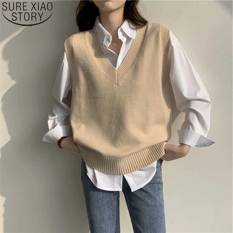 Винтажный вязаный жилет, женский свитер без рукавов, майка с V-образным вырезом, уличная одежда, повседневный Свободный корейский пуловер, одежда на осень и зиму 17335