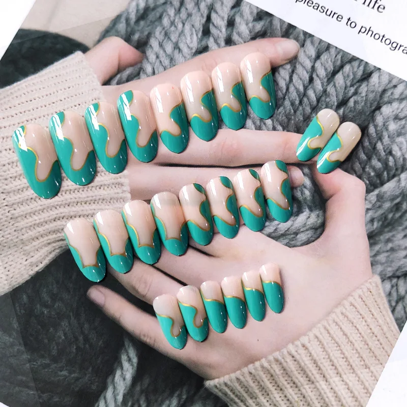 Лидер продаж, накладка на ногти с длинной круглой головкой, мятно-зеленая Золотая проволока, волнистый Сращивание ногтей, готовый продукт