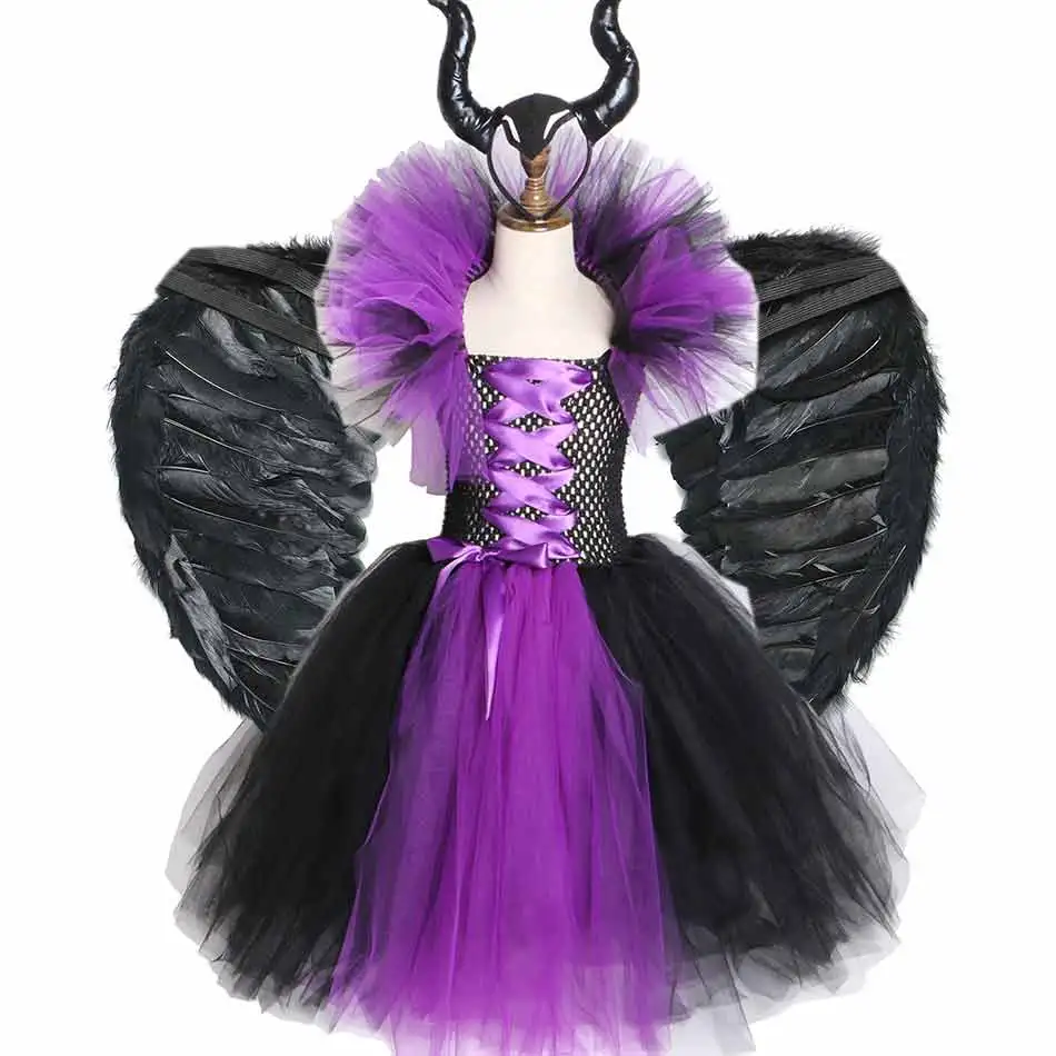Хэллоуин Девушки малефисент платье черный Дьявол Королева Косплей платье пачка костюм Маскировка вампир одежда с перьями шаль