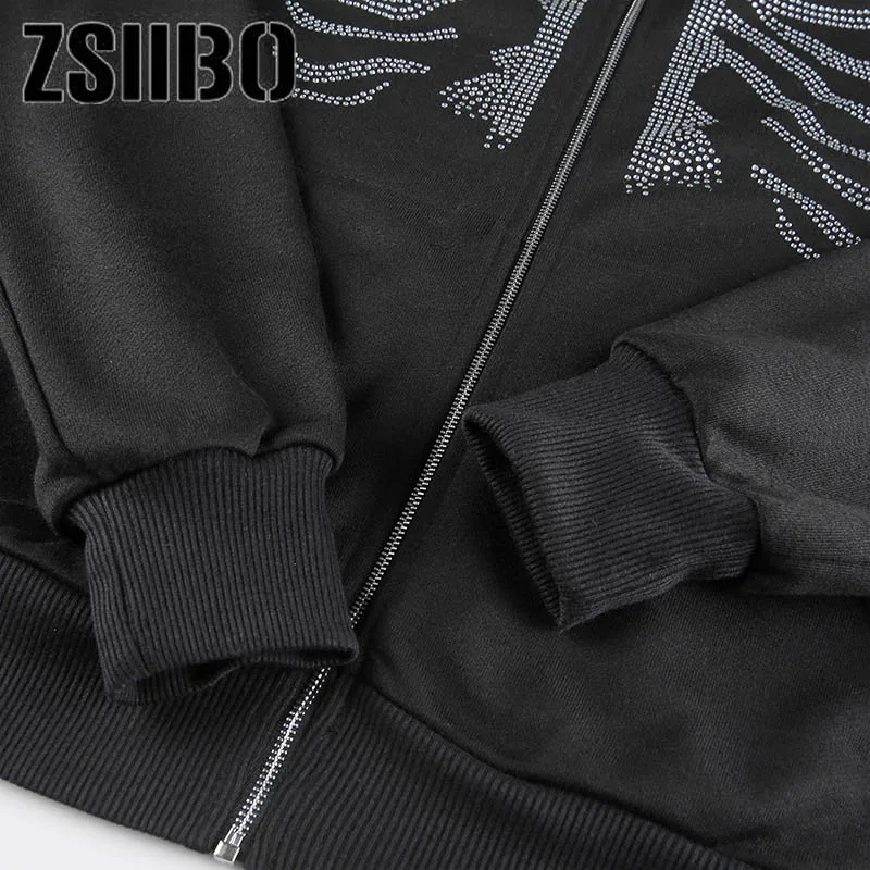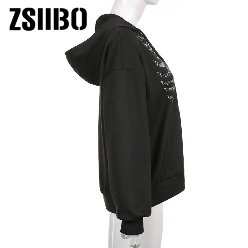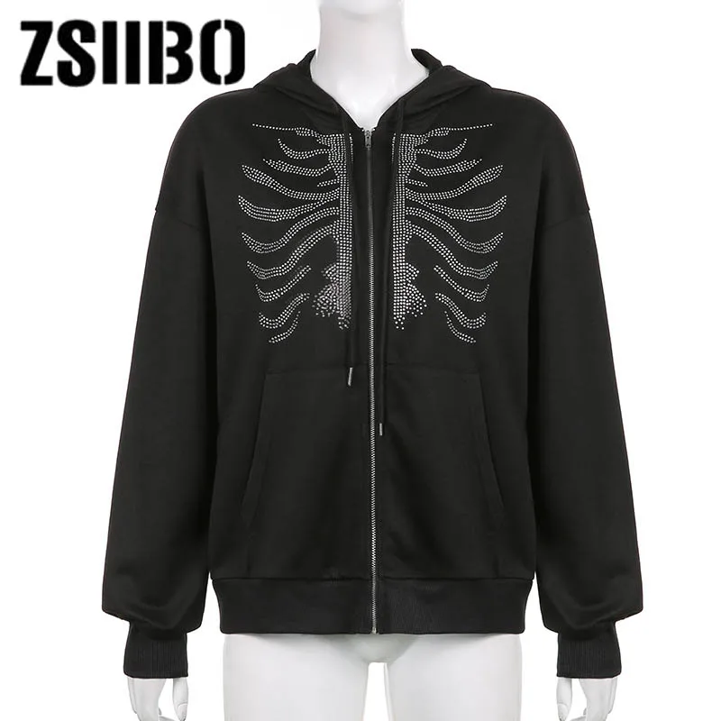 Женские толстовки большого размера Y2K Стразы со скелетом на молнии худи Женская куртка с капюшоном уличная одежда спортивный костюм Женская ткань в стиле ретро