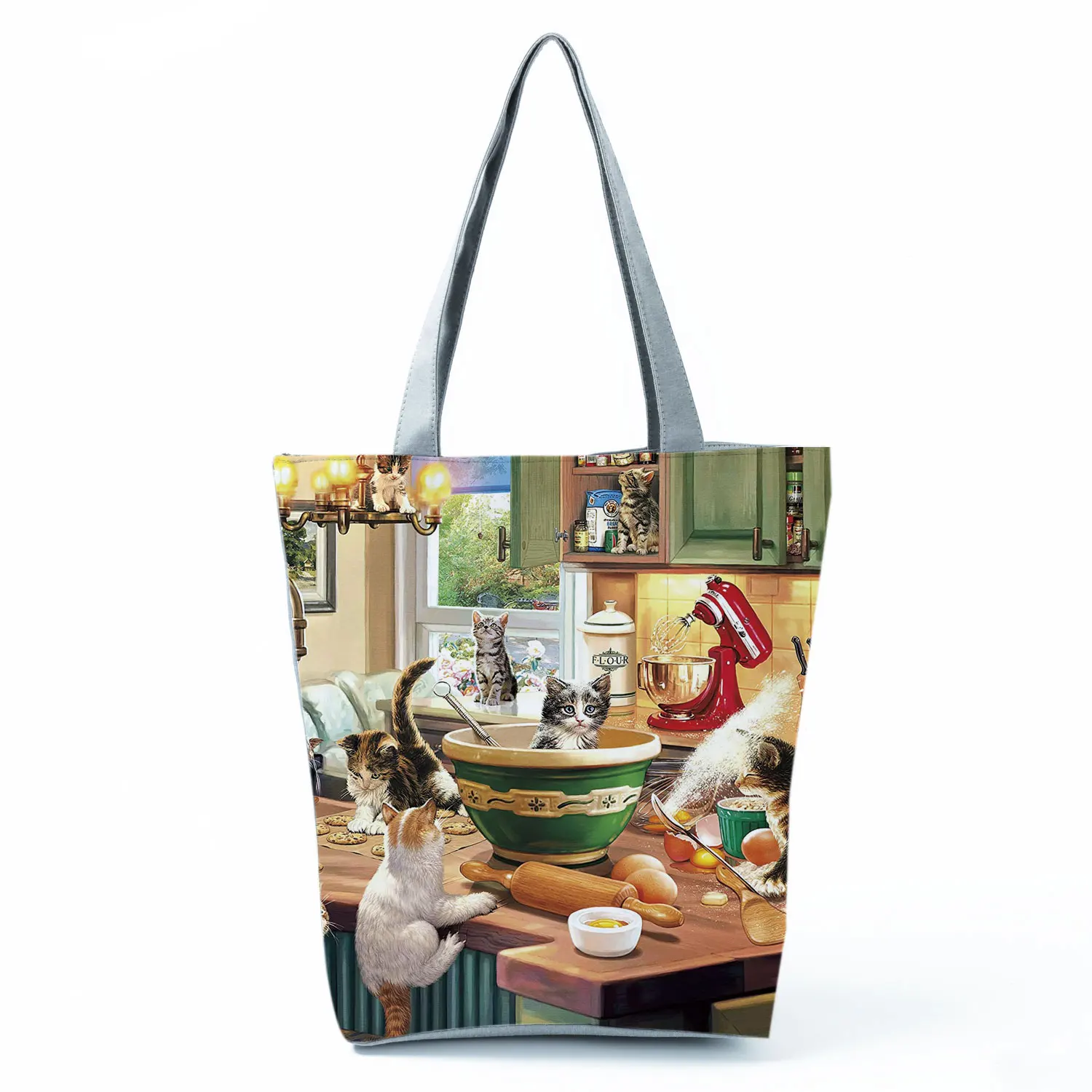 Женские сумки с рисунком кота и масляной живописи, пляжные сумки с животными для женщин, женская сумка для покупок на плечо, кухонные многоразовые сумки для продуктов
