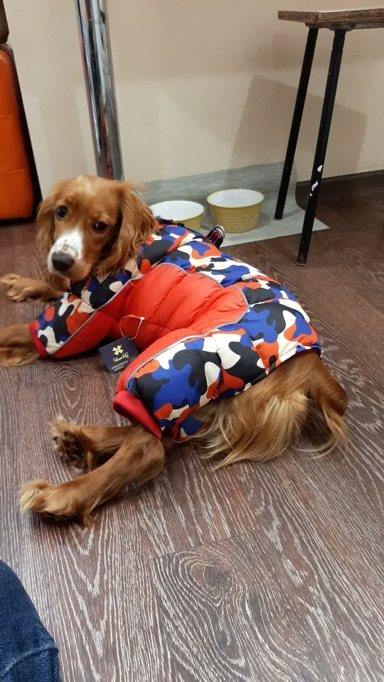 долго не решалась заказать комбез спаниелю, т.к. по отзывам в основном берут совсем маленьким породам, и боялась прогодать с размером. задала вопрос продавцу, выслала мерки, продавец порекомендовал 18-20 размер. я взяла 22 и не прогадала, хотя волновалась что будет большой! (за неправильную подсказку размера снимаю 1 звезду) а получился только только. моей собаке год размер 22, если кому понадобится. сам комбез мне понравился, хорошо сшит, яркий. выглядит прилично