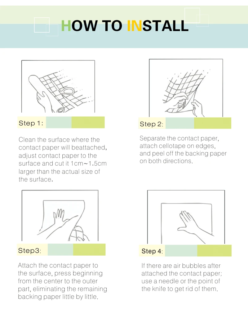 Шаг 1:Очистите поверхность, на которую контактной бумаги будет beattached, отрегулировать контакт бумаги на поверхность и сокращения ваших расходов на 1 см-1,5 смБольше фактического размера поверхности.Шаг 2:Отделите контактную бумагу, прикрепите ее к краям и снимите подложкуОбе стороны.Шаг 3:Прикрепите контактную бумагу к поверхности, нажмите, начиная от центра до внешней части,Удаляет оставшуюся подложку понемногу.Шаг 4:При наличии пузырьков воздуха после прикрепления контактной бумаги Используйте иглу или точку ножа, чтобы избавиться от них