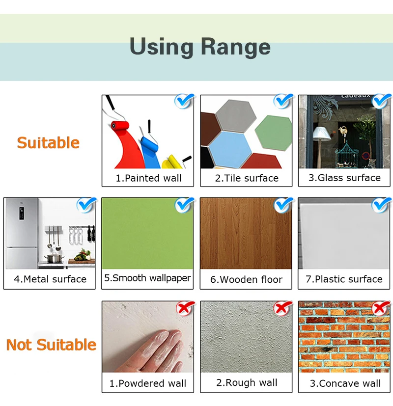 Использование диапазона1. Окрашенная стена2. Поверхность Плитки3. Стеклянная поверхность4. Металлическая поверхность5. Гладкие обои6. Деревянный пол7. Пластиковая поверхностьНе подходит:1. Порошковая стена2. Роуд стена3. Вогнутая стена