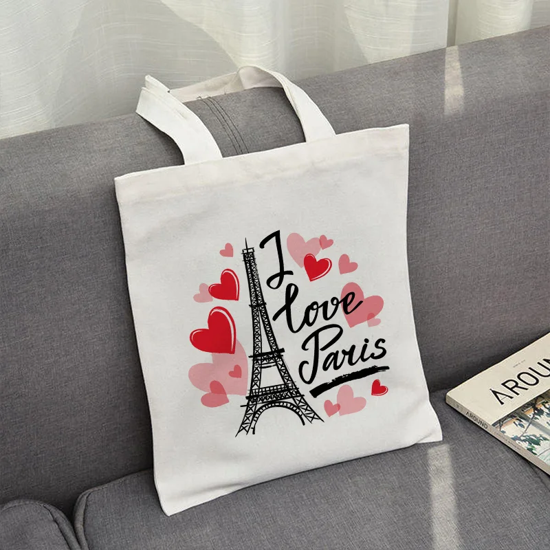 Сумка-шоппер с принтом Love I Paris, сумка для покупок, сумка-тоут, холщовые сумки, женская наплечная сумка из хлопчатобумажной ткани, Женская эко-сумка, многоразовая сумка для продуктов