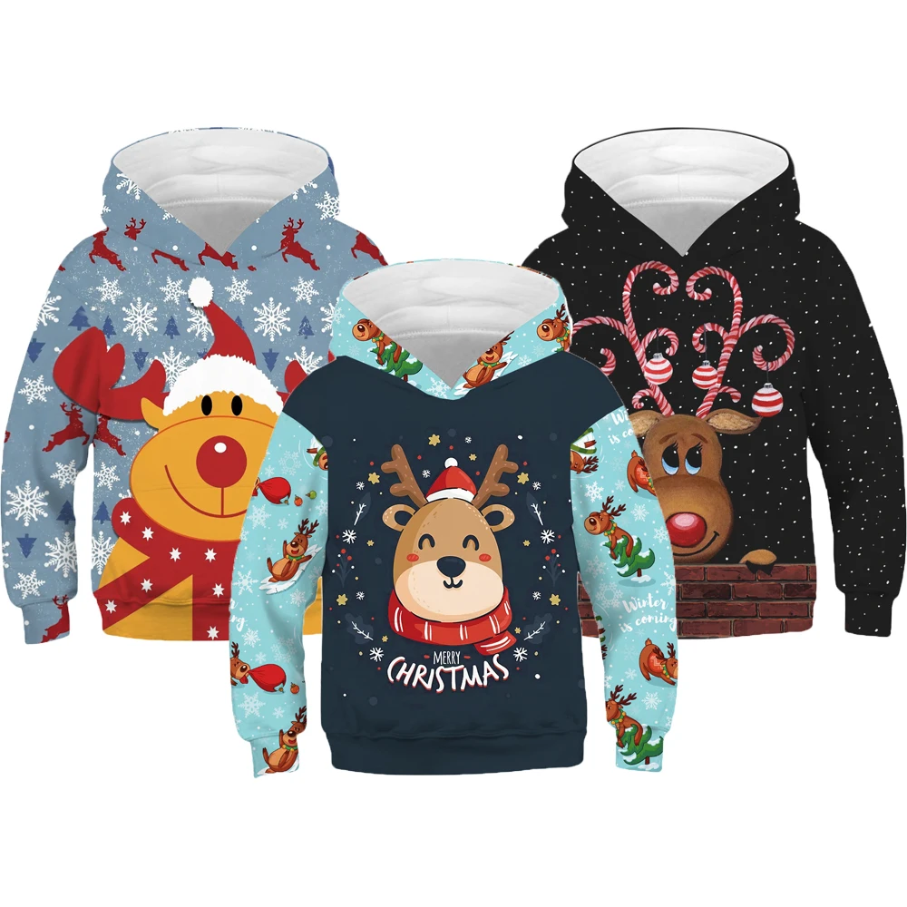 Новинка, худи в рождественском стиле для мальчиков и девочек, осенняя Толстовка большого размера с капюшоном и мультяшным оленем для детей, Детский подарок на день рождения