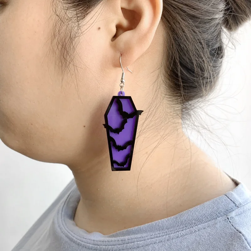 Готическая фиолетовая гробная гравировка с черной летучей мышью и пауком, асимметричные акриловые Висячие серьги, подарок на Хэллоуин