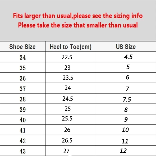 Внимание, пожалуйста1. Выберите размер в соответствии с длиной Вашей стопы (Не выбирайте размер в соответствии с обычным размером в вашей стране!)2. Длина стопы ✮длина стельки ③ длина подошвы, например: США 4,5 (25,5 см). Это 25,5 см означает только длину стельки.3. Лучше выбрать на 1-2 размера больше, если у вас широкая стопа или подъем стопы немного толстый.4. Светильник, оборудование камеры и дисплеи могут вызвать разницу в цвете. Если вы возражаете, пожалуйста, не платите. Спасибо.5. Допускается погрешность в размере 0-0,5 см из-за ручного измерения.