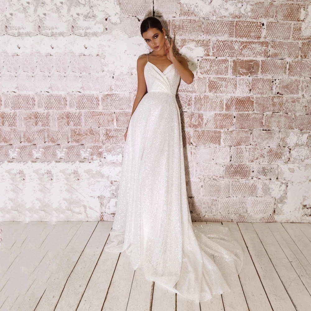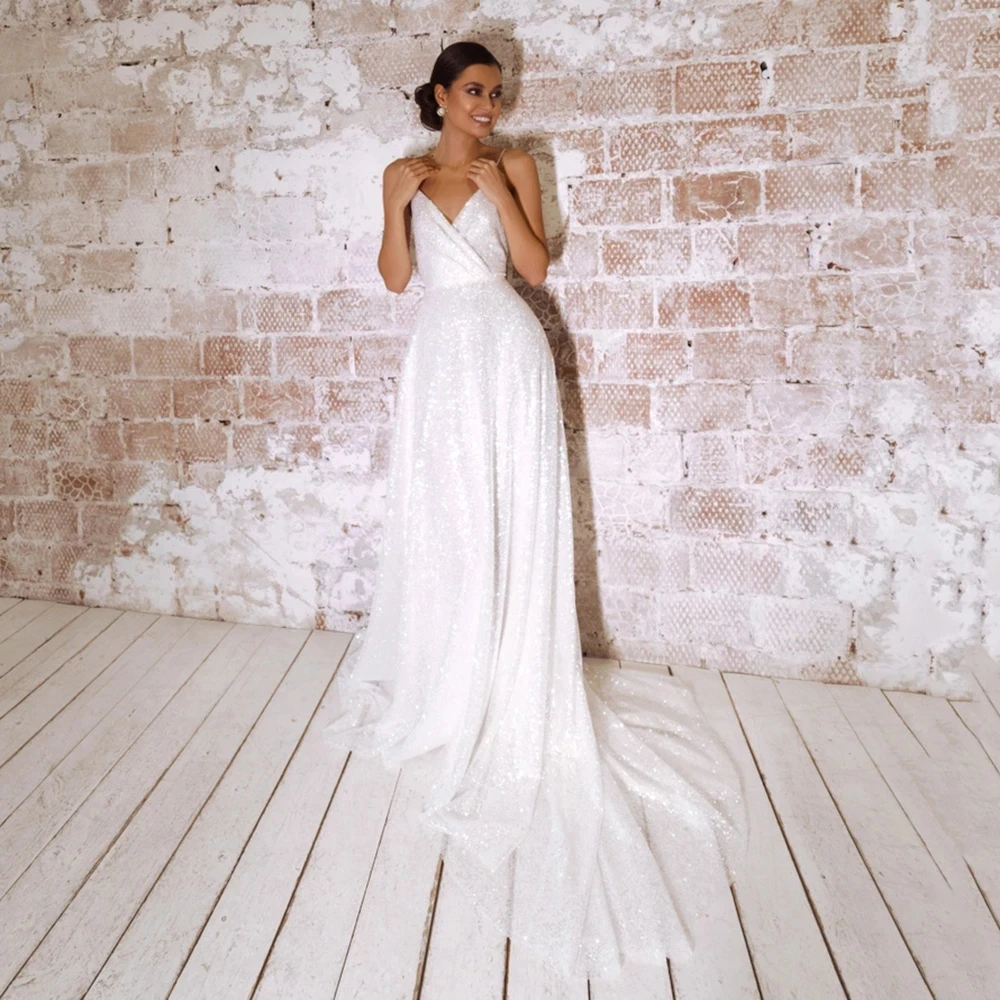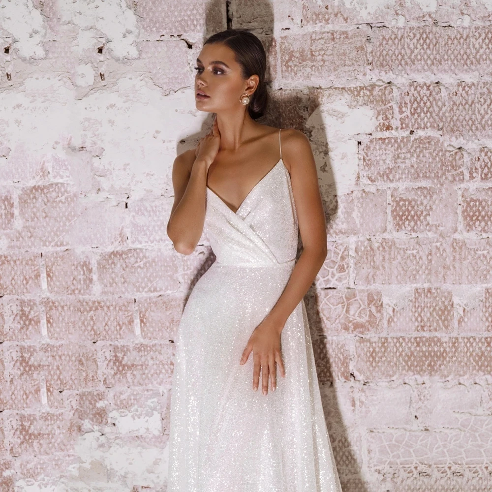 Длинное свадебное платье цвета слоновой кости с V-образным вырезом и блестками