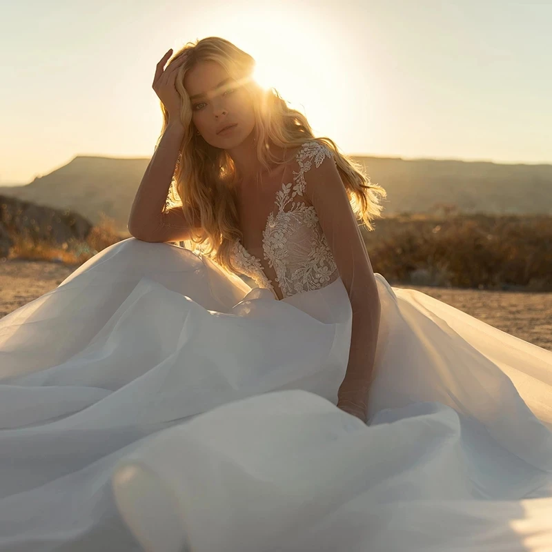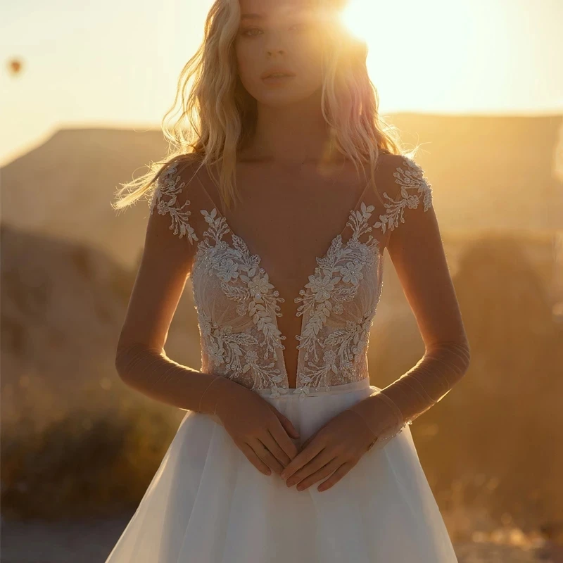Кружевные свадебные платья с V-образным вырезом и длинными рукавами