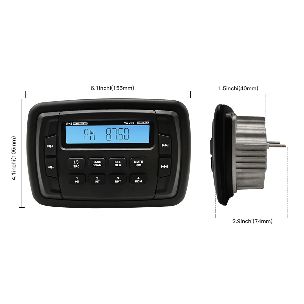 Уровень водонепроницаемости: IPX66: попадайте в воду и наслаждайтесь музыкой с морской стереосистемой. Благодаря классу IPX6 и стандарту ASTM 117 «Соль/туман», прочному алюминиевому шасси, современным атмосферостойким материалам и УФ-покрытиям, это радио защищено от элементов.