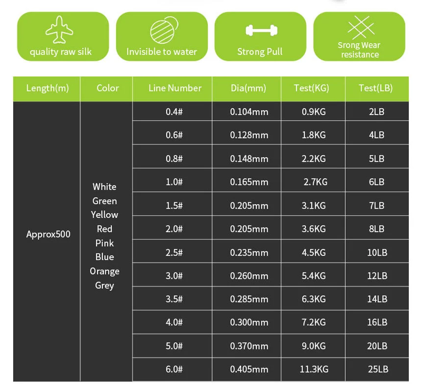 Мощная нейлоновая леска, быстрый ввод воды, хорошая резка воды, сильное сокрытие, устойчивость к истиранию и высокая прочность на растяжение.