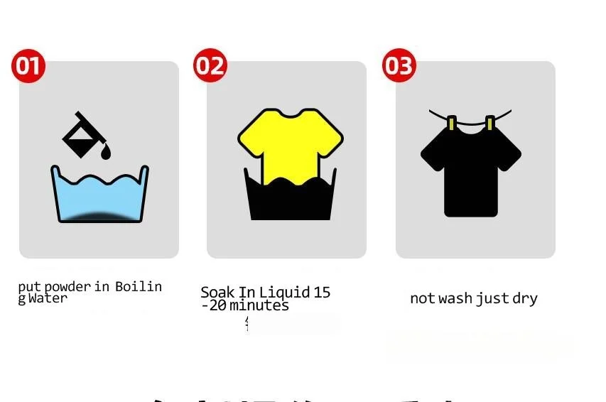 Замочите одеждуDЖидкость для жидкости около 30 минут(Полностью Переворачивайте одежду каждые 3 минуты, чтобы одежда равномерно окрашивалась)
