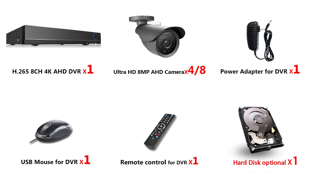 1 х 8-канальный H.265 AHD 4K DVR 6 в 1 цифровой видеорегистратор;4/8 x HD 8.0MP Крытый Открытый ИК День ночного видения атмосферостойкие камеры;1 х адаптер питания для DVR;1 X USB мышь для DVR;1 пульт дистанционного управления для DVR;1 X CD программное обеспечение для DVRЖесткий диск опционально!