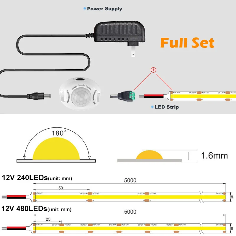 Спецификация:Мощность Вход: 100 ~ 240V 50/60HzВыходная мощность: 240 светодиодов/m-12V2A, 480 светодиодов/m-12V3A.Ширина печатной платы: 240 светодиодов/m-8mm, 480 светодиодов/m-8mm.Количество СВЕТОДИОДНЫЙ: 240 светодиодный s/m, 480 светодиодный s/m.Длина резки: каждые 50 мм (240 светодиодов/м), каждые 25 мм (480 светодиодов/м).Цветовая температура: теплый белый (2700K), теплый белый (3000K), натуральный белый (4000K), холодный белый (6000K).Индекс цветопередачи: Ra>90.Рабочая температура: -20 ℃-+ 45 ℃.Температура хранения: -20 ℃-+ 60 ℃.Угол обзора: 180 °. Посылка включает:1 × 5 м COB светодиодный ленточный светильник.1 × переключатель датчика движения1 × блок питания DC12V.