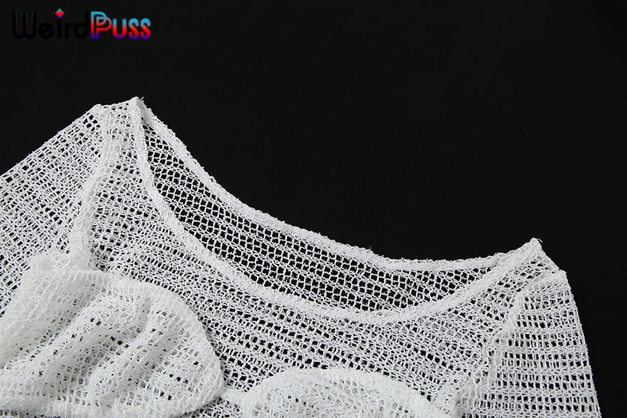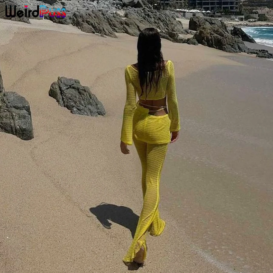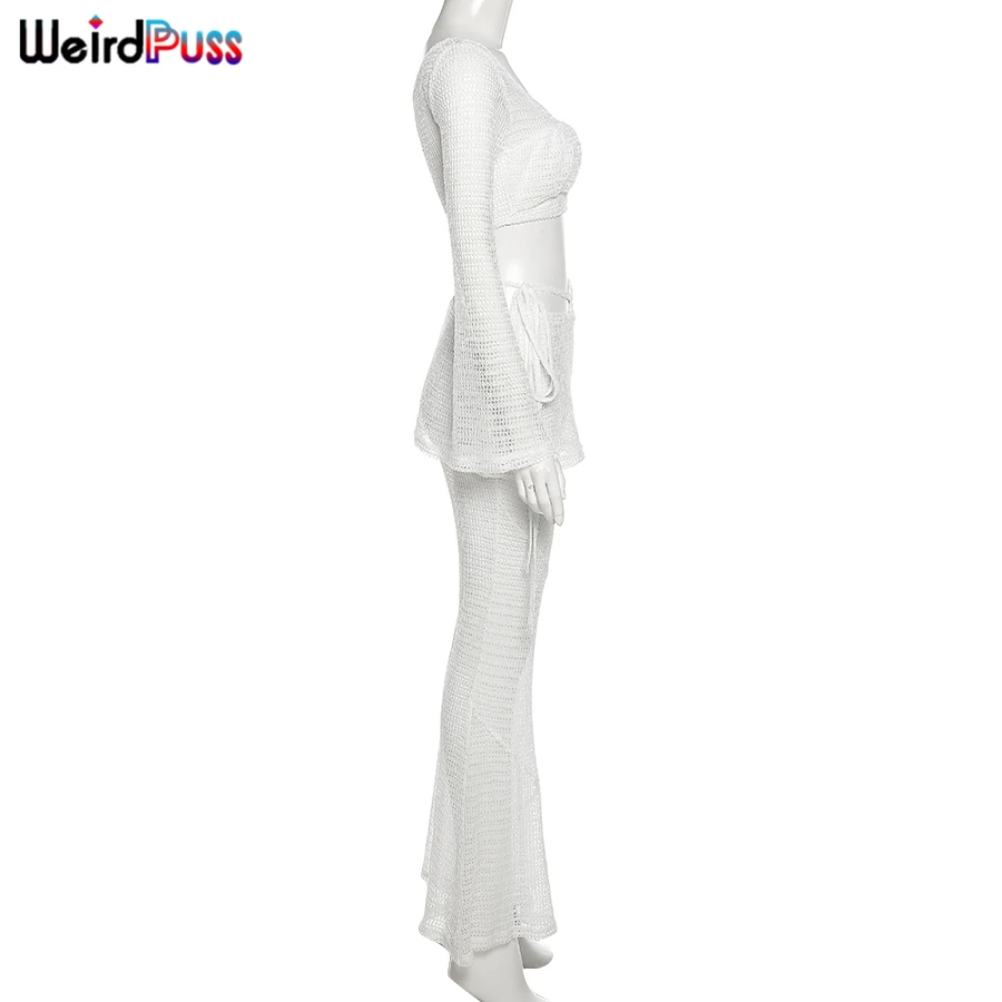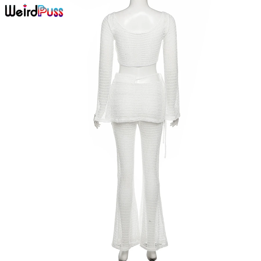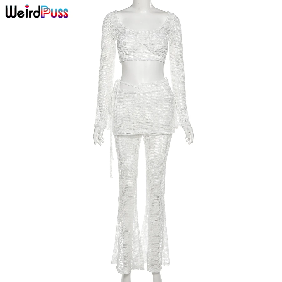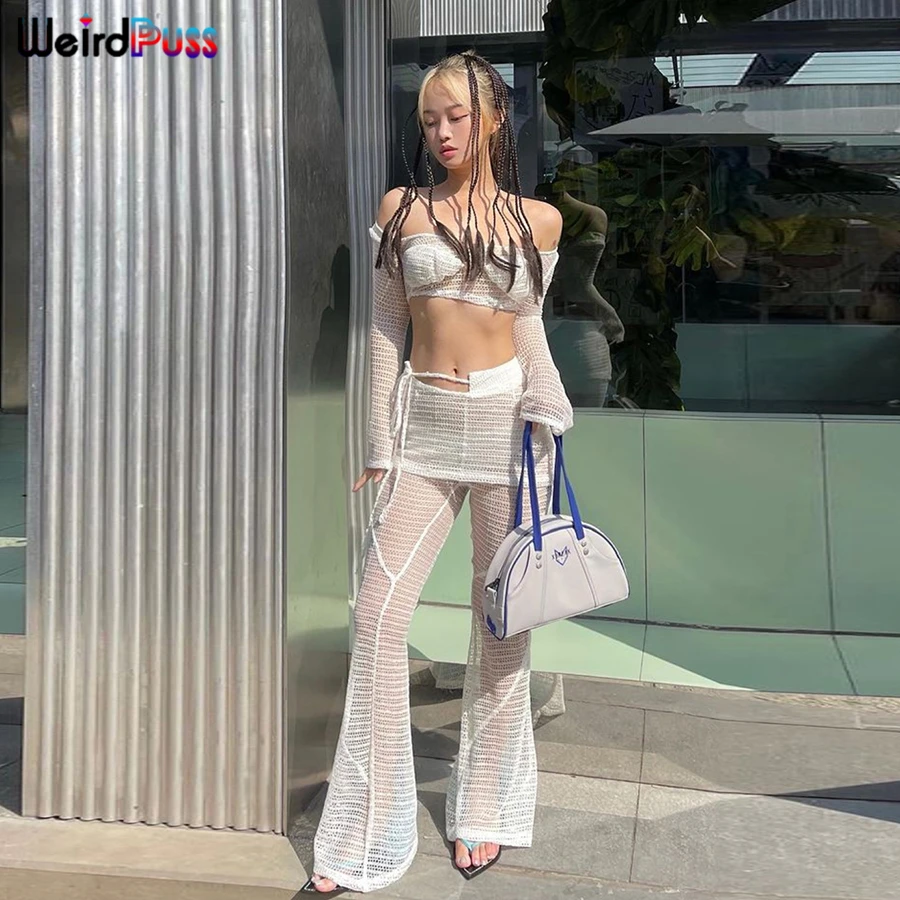 Необычный сексуальный женский комплект из 2 предметов с пушистыми вырезами, прозрачный укороченный топ с вырезом лодочкой + бандажные расклешенные брюки, тонкие подходящие костюмы для отпуска