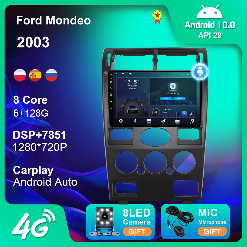 Автомагнитола 6 + 128G для Ford Mondeo 2000-2006, мультимедийная система с GPS-навигацией, 4G, Wi-Fi, BT, Carplay, автомагнитола на Android, без DVD-плеера, 2 Din, стерео