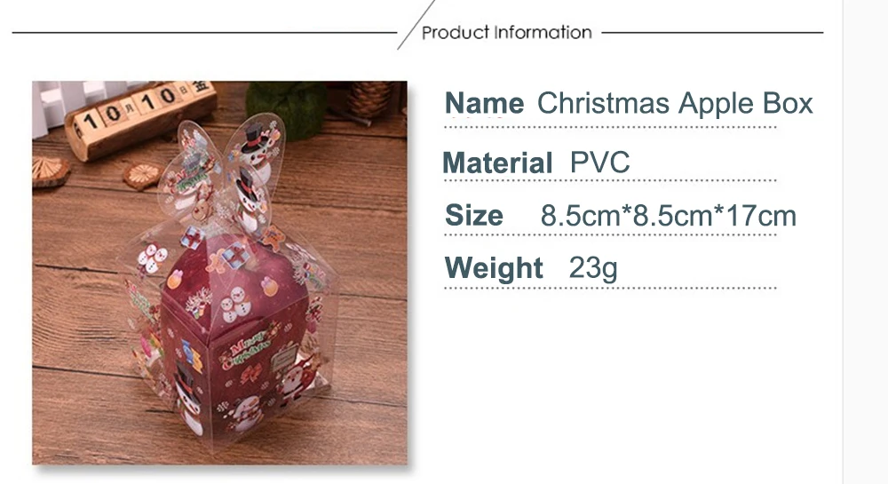 * Эти очаровательные подарочные коробки-идеальный способ представить Счастливое Рождество.* Эти коробки предназначены для хранения яблочного, маленького подарка или сувенира, вы также можете поместить маленькое печенье/сладости в качестве коробки для благовоний.* Коробки прибывают в плоскую упаковку, их легко собрать.* Также идеально подходит для использования в бизнесе, это сделает ваше печенье более профессиональным и привлекательным.* Включает 10 коробок. Материал: ПВХКаждый размер коробки: 8,5 см * 8,5 см * 17 см