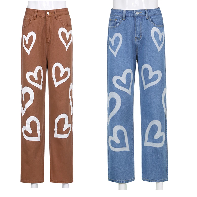 Женские винтажные мешковатые джинсы Y2K с принтом сердечек, женские брюки с высокой талией в стиле Харадзюку, эстетичные джинсы для мам, джинсовая уличная одежда, брюки 90-х