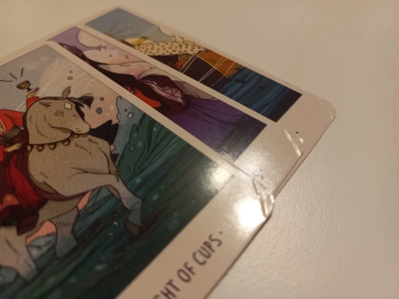 В целом, за такую цену, колода приемлемая. Из основных претензий: печать мыльная, цвета грязные, рубашка у карт не симметричная (картинка съезжает в сторону), как и на внутренней стороне карт, так картинки тоже напечатаны криво. Ознакомиться или подержать в ручках — пойдет, но работать с ней не хочется.