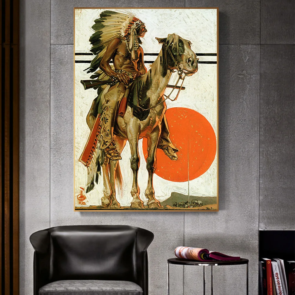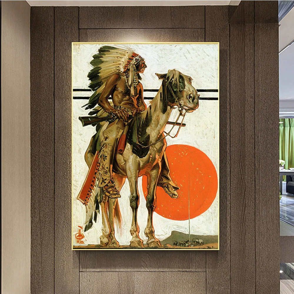Индейцы, ездящие на лошадях, закат, фотообои с рисунком на холсте, художественные картины для гостиной, украшение для стены дома