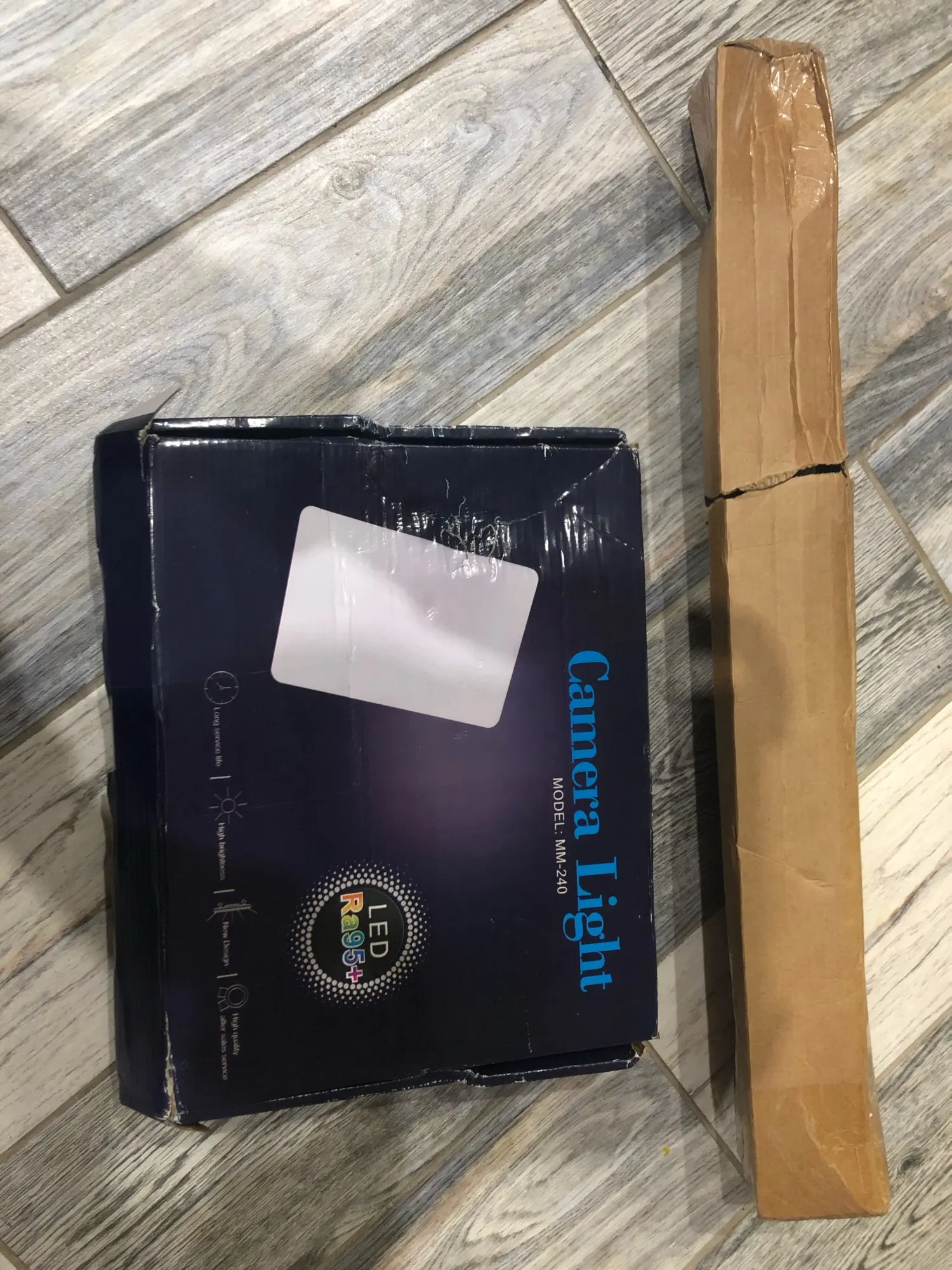 Самим товаром довольна! Но коробка конечно была в ужасном состоянии, если вдруг хотите брать на подарок, то в таком виде конечно не подаришь) Но по качеству сама лампа отличная, высота штатива соответсвует указанной, может даже выше, лампа работает отлично, мощной яркости, все режимы работают. В пульте батарейки в комплекте не идут