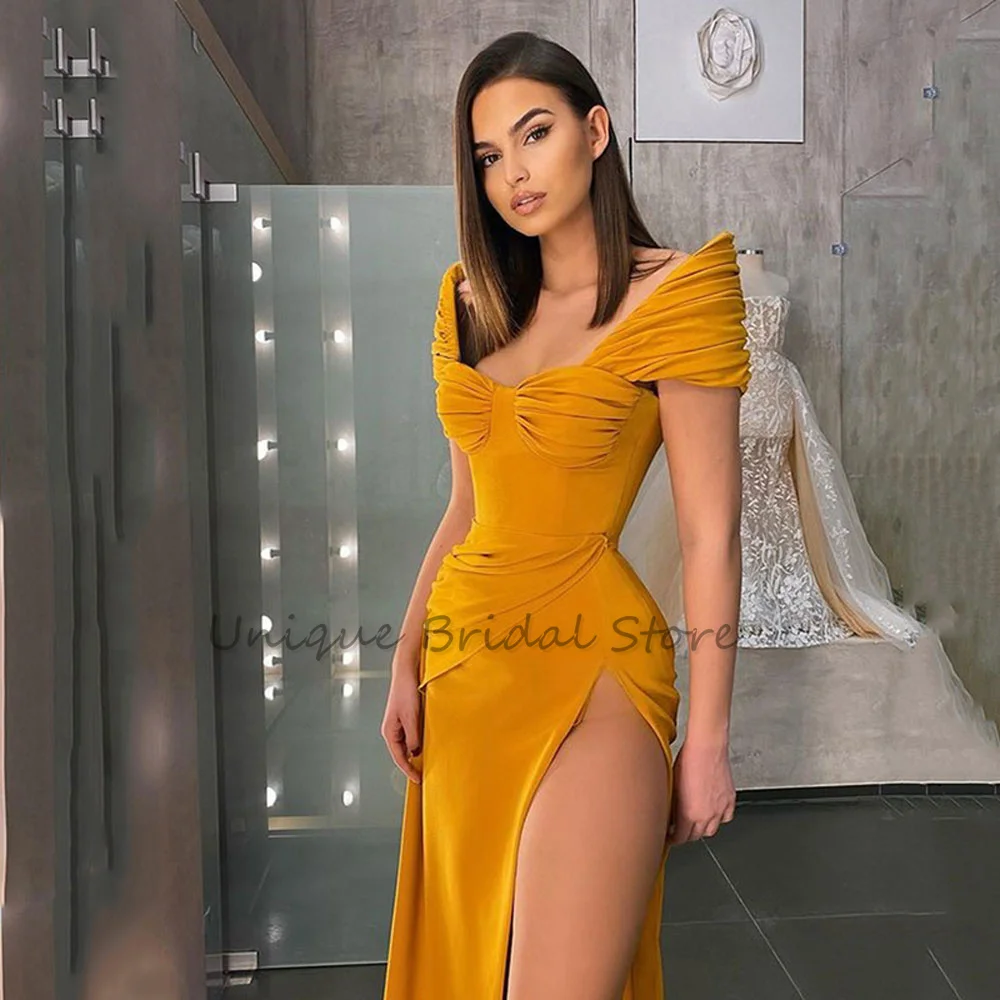 Женские сексуальные Желтые Вечерние платья с высоким разрезом сатин без рукавов