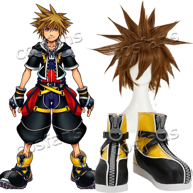 Обувь для косплея Kingdom Hearts 2 Sora, маскарадные ботинки для хэллоуивечерние, короткие коричневые и желтые термостойкие волосы, парик для косплея