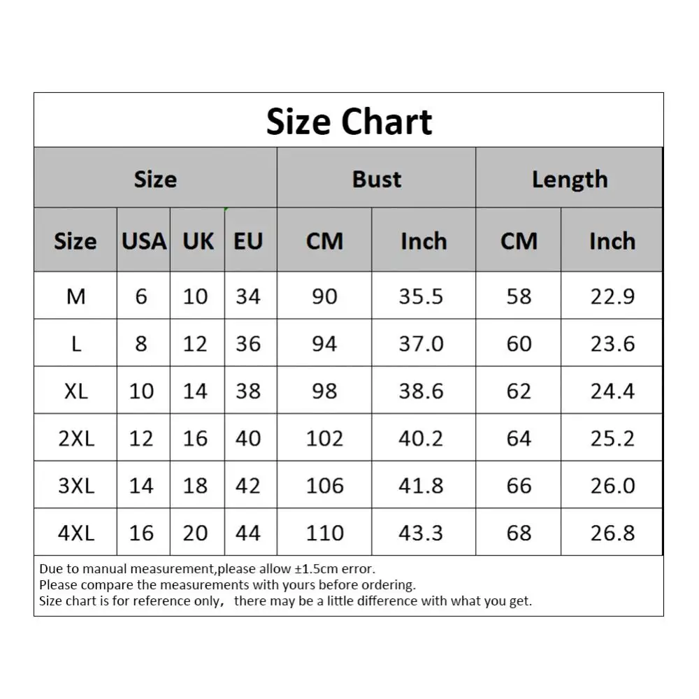 [Наш Размер M] Бюст: 90 см/35,4 дюйма, длина: 58 см/22,8 дюйма (прибл.) [Наш Размер L] Бюст: 94 см/37 дюймов, длина: 60 см/23,6 дюймов (прибл.) [Наш Размер XL] Бюст: 98 см/38,6 дюйма, длина: 62 см/24,4 дюйма (прибл.) [Наш Размер 2XL] Бюст: 102 см/40,2 дюйма, длина: 64 см/25,2 дюйма (прибл.) [Наш Размер 3XL] Бюст: 106 см/41,7 дюйма, длина: 66 см/26 дюймов (прибл.) [Наш Размер 4XL] Бюст: 110 см/43,3 дюйма, длина: 68 см/26,8 дюйма (прибл.)