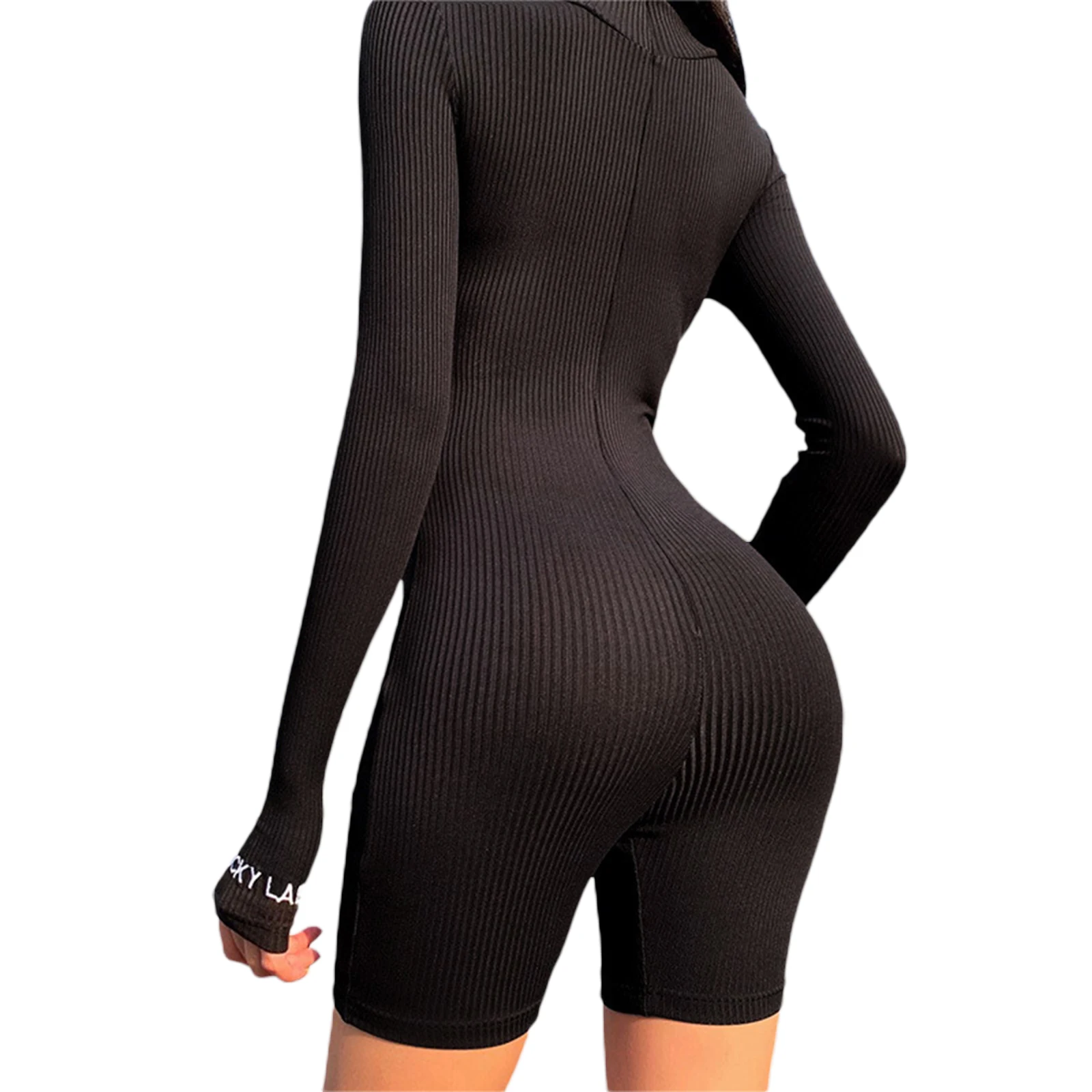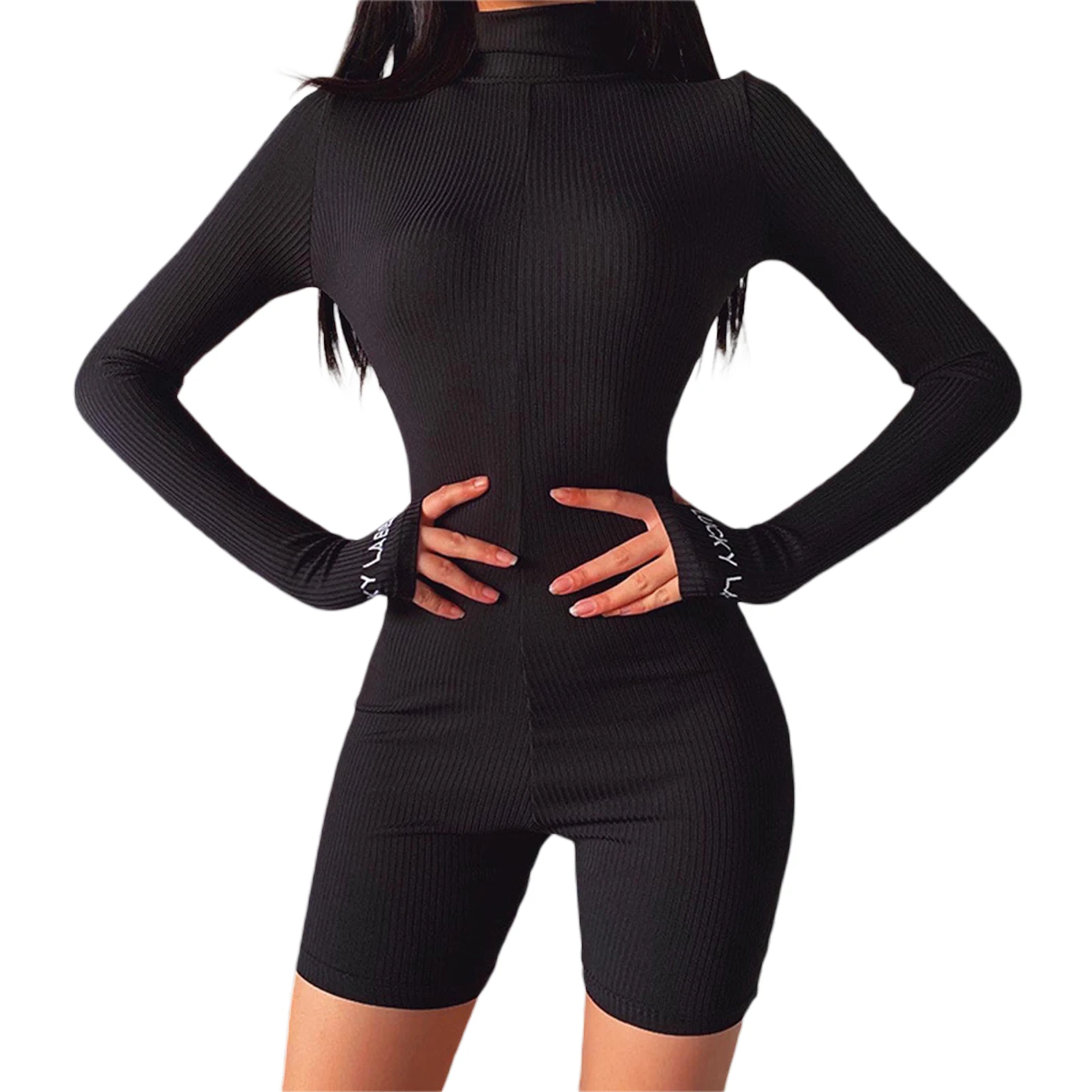Женский трикотажный комбинезон в рубчик, Облегающий комбинезон с длинными рукавами и вышивкой букв, Облегающий комбинезон с высоким воротником, комбинезон