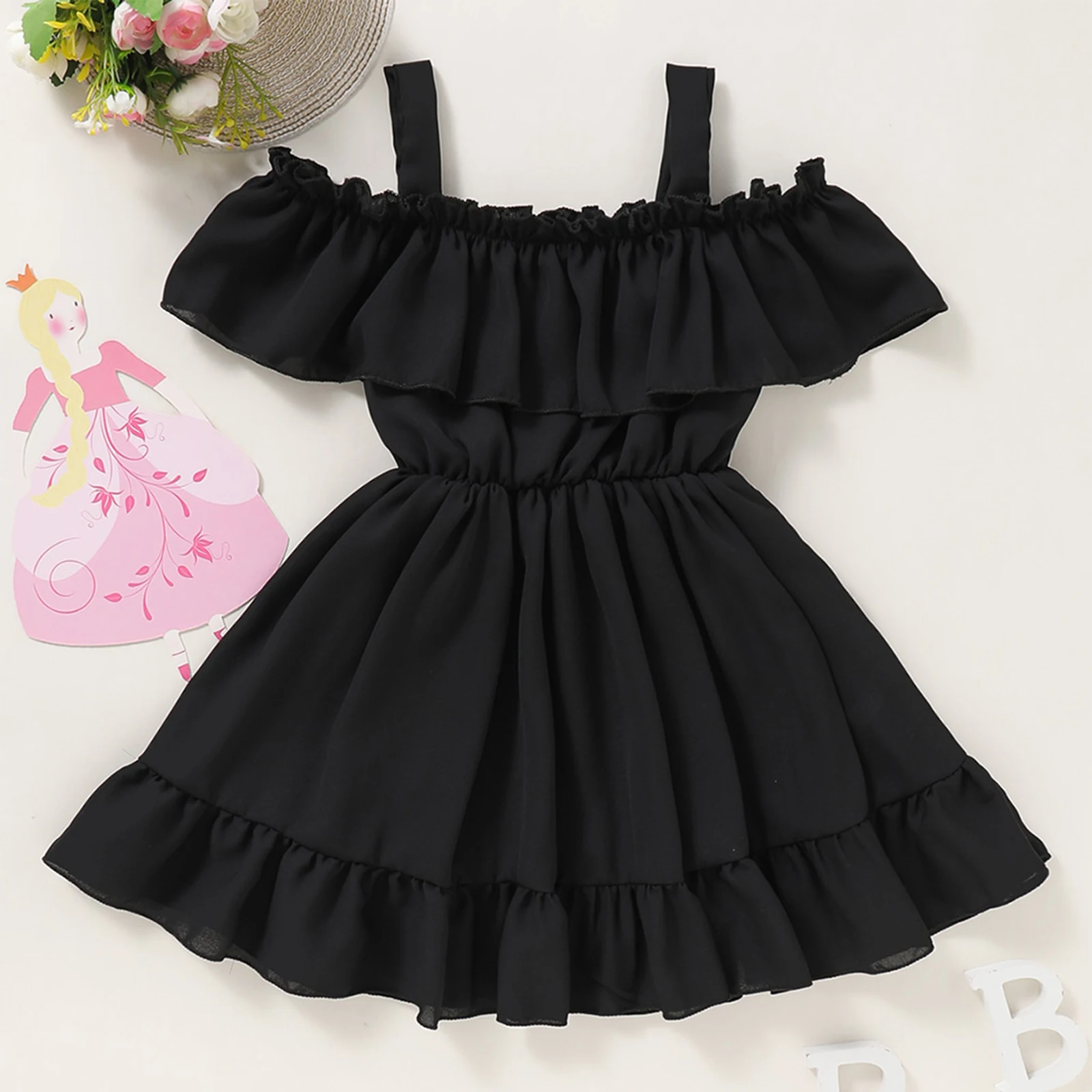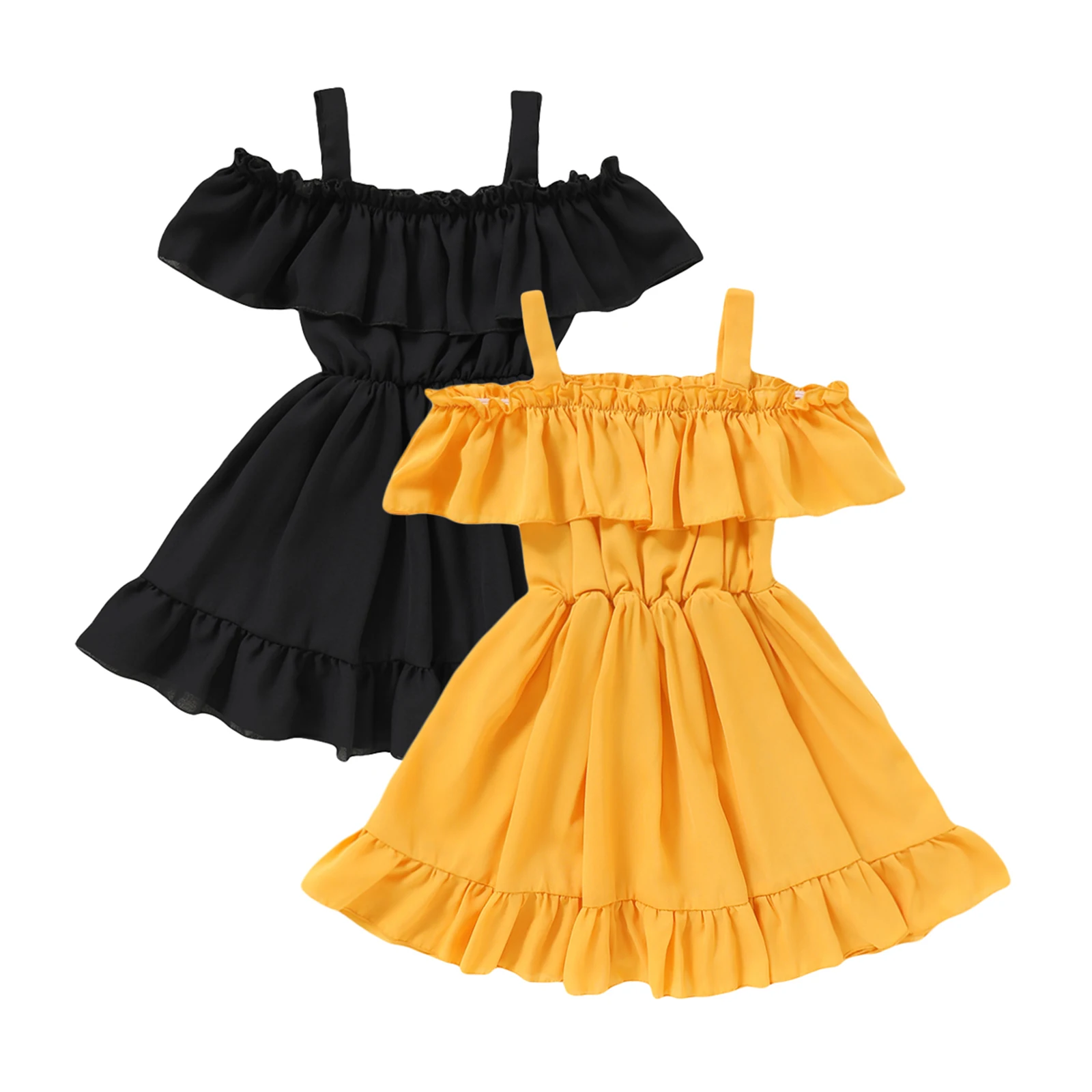 Платье принцессы для маленьких девочек, однотонное модное милое летнее ТРАПЕЦИЕВИДНОЕ ПЛАТЬЕ с открытыми плечами и лямками с оборками, детская одежда