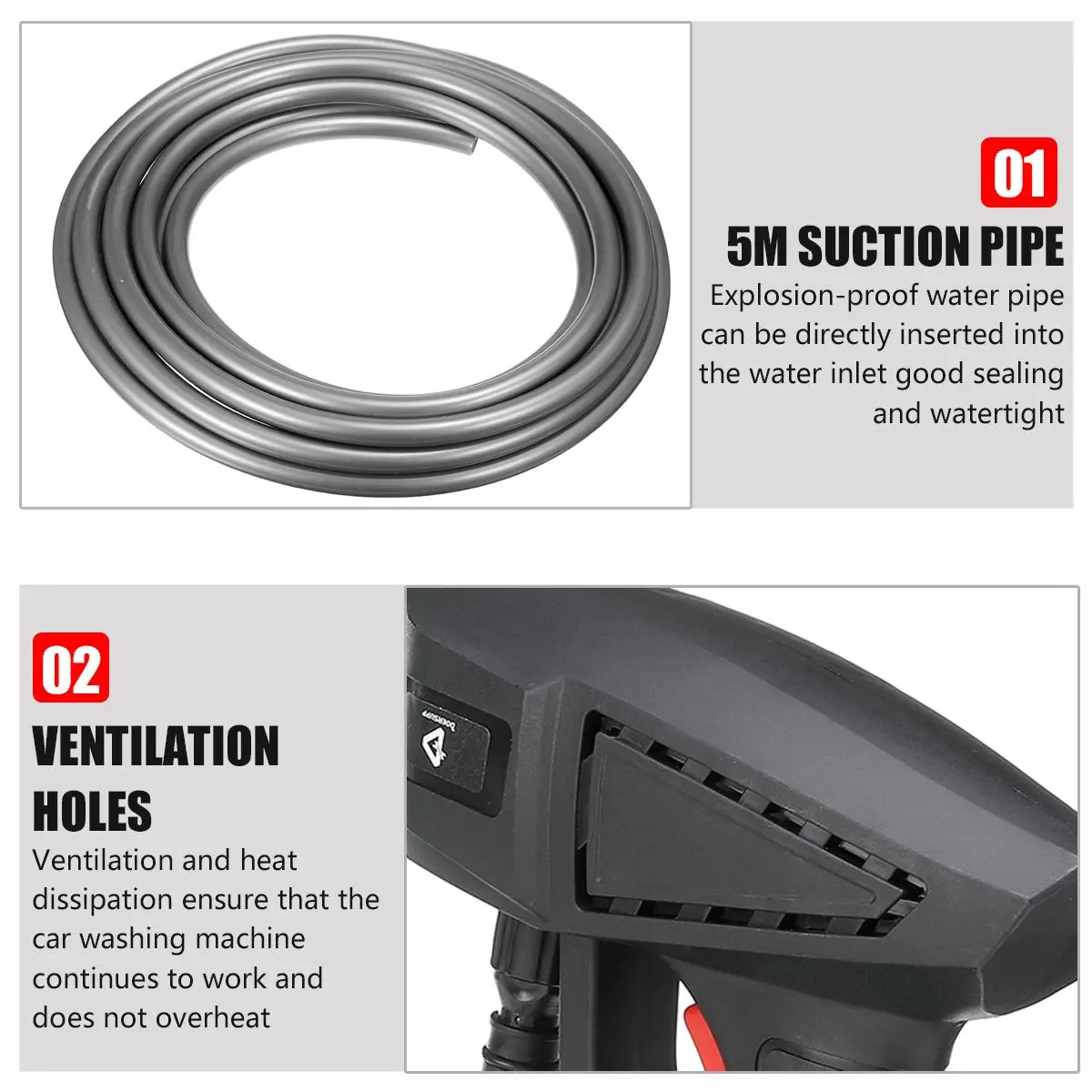 Особенности:● Дисплей уровня заряда батареи● Легкое хранение без места● Идеально подходит для полива сада, орошения в сельском хозяйстве, мытья автомобилей, уборки дома и т. д.● Сердечник из чистой медиВысокая мощность, сильная мощность, более прочный● Регулировка типа воды2 выхода воды + 1 сопло коробки пены, бесплатное преобразование трех типов воды● Пенопластовый горшокБыстрое вспенивание, богатая и деликатная пена, быстрая Чистка● Литиевая батарея большой емкостиДолговечность, портативный и съемный аккумулятор● Тонкий фильтр из АБС-пластикаГлубокая фильтрация примесей в воде, защита водяного насоса, длительный срок службы