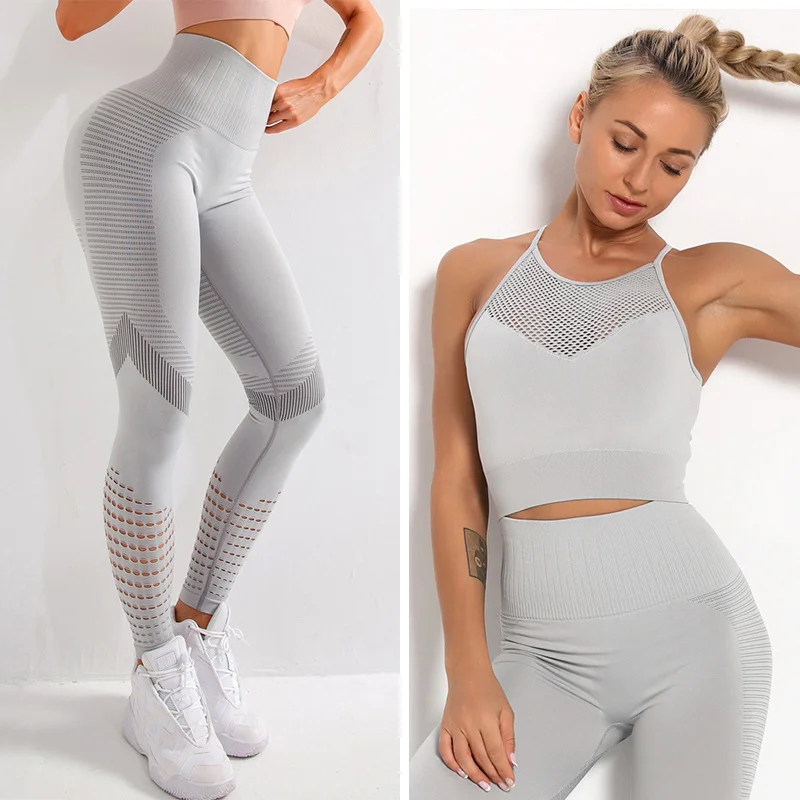 Бесшовный Женский костюм для йоги, спортивная одежда, брюки с высокой талией, фитнес-бюстгальтер и ажурные леггинсы для женщин, одежда для спортзала и активного отдыха, 2 шт.компл.