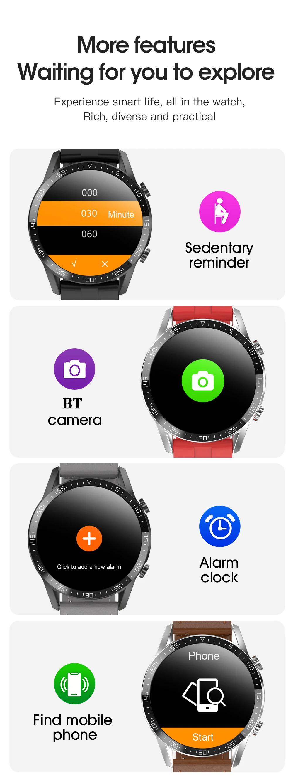 Большой экран высокой четкости обеспечивает четкое изображениеОпыт на вашем запястье. Классический двойнойКоронки из нержавеющей стали.Стальной корпус и стеклянный Безель прочные иИзносостойкий, новый и прочный. Тонкий корпус,Легко сочетается с светильникУдобный фторкаучуковый ремешок или другие ремешки,Вы можете легко контролировать любой случай.