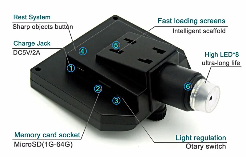 Спецификация:Пиксель: HD 3.6MP CCDДисплей: 4,3 дюймов HD OLED ДисплейУвеличение: 1-600x система непрерывного увеличенияРасстояние объекта: 15 мм-бесконечностьСо встроенной литиевой батареей, непрерывная работа в течение 6 часовЯзыки: английский, испанский, русский, корейский, японский, тайский, иврит, португальский, немецкий, французский, Италия, Турция, чешский, польский, традиционный китайский, упрощенный китайскийРазрешение: 1080P, 720P, VGAТег даты: отображается/не отображаетсяОбнаружение движения: вкл/выкл (когда он включен, он начнет записывать видео автоматически, как только обнаружит что-то движется)Циклическая запись: выключение/3 минуты/5 минут/10 минутКарта памяти заполнена, она автоматически удалит первое видео и сохранит новое видеоЗначение экспозиции: + 2,0/(0,0)-2,0Формат: Yse/NOЯзык: 16 видов языковАвтоматическое выключение: выключение 1 минутыАвтоматическое выключение ЖК-дисплея: выключено 1 3 5 минутЗаводской Сброс: да/нетЧастота источника: 50 Гц, 60 Гц светильникНастройка времени: год/месяц/день/часы/минуты/секундыВключение/выключение изображенияСветильник: вкл/выклВерсия программного обеспечения: V1.10Источник питания: 110-240 В