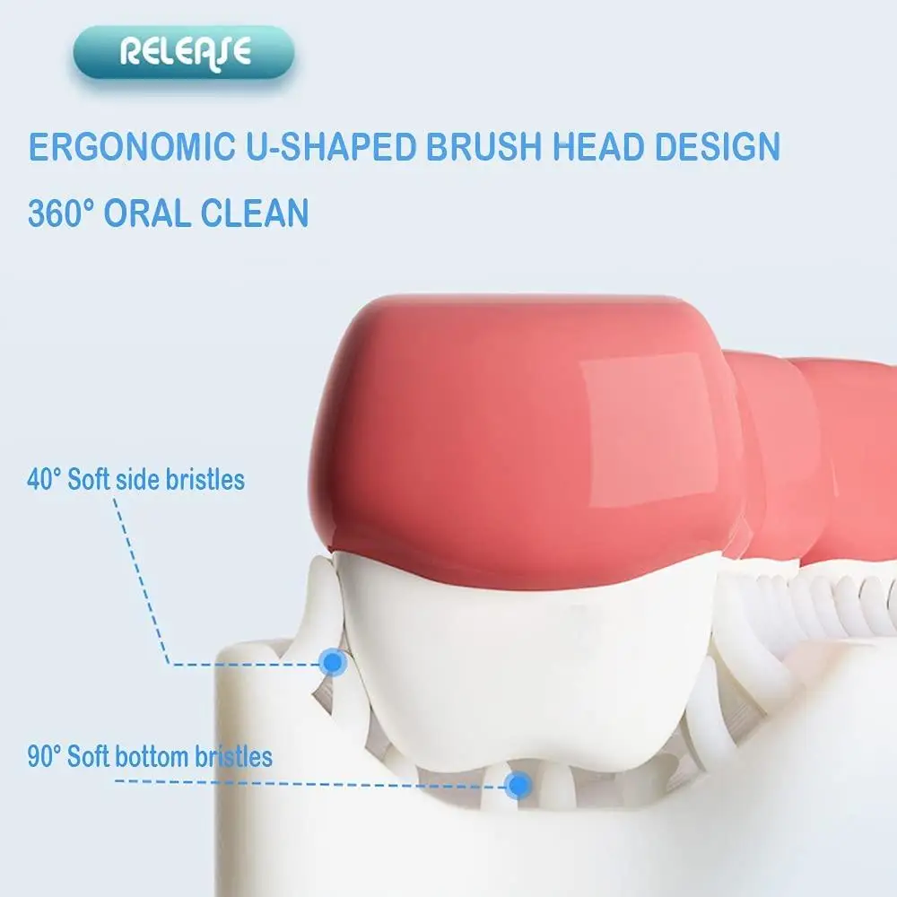 【Креативный дизайн U-SHAPED 】 эргономичная u-образная головка щетки, подходит для формы и механики структуры зубов детей. Уникальный дизайн для детских нежных десен и чувствительных зубов.