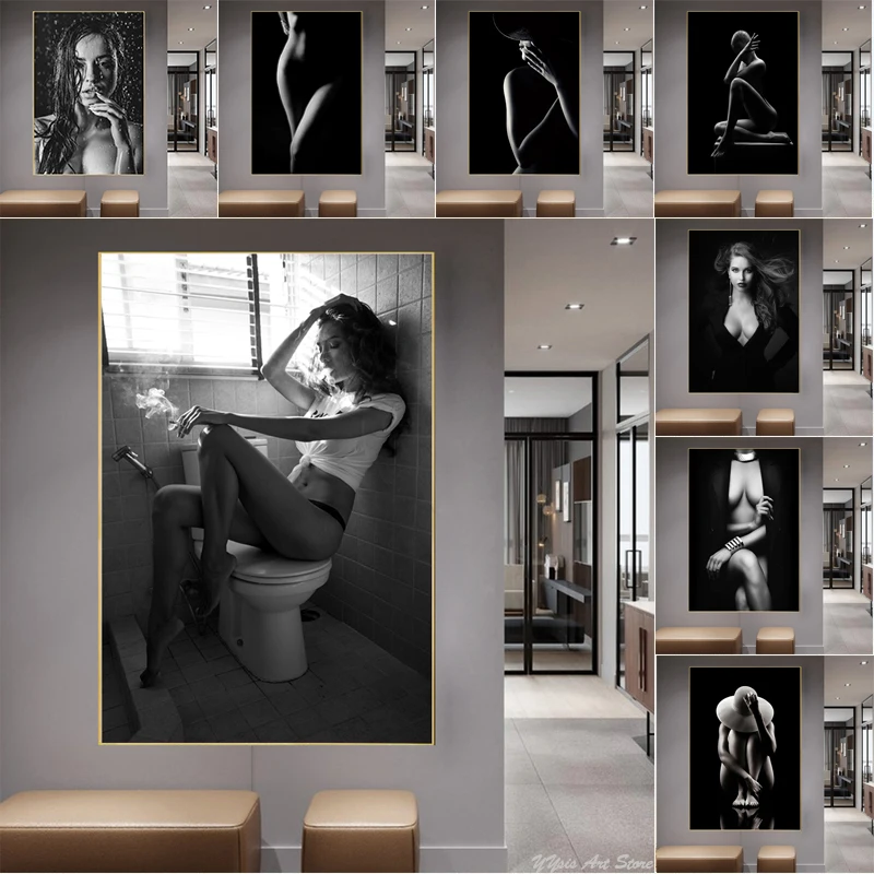 Плакат с изображением соблазнительной обнаженной женщины, черно-белого цвета, Картина на холсте с изображением девушек для курения в туалете, Настенная картина для уборной, Декор для дома
