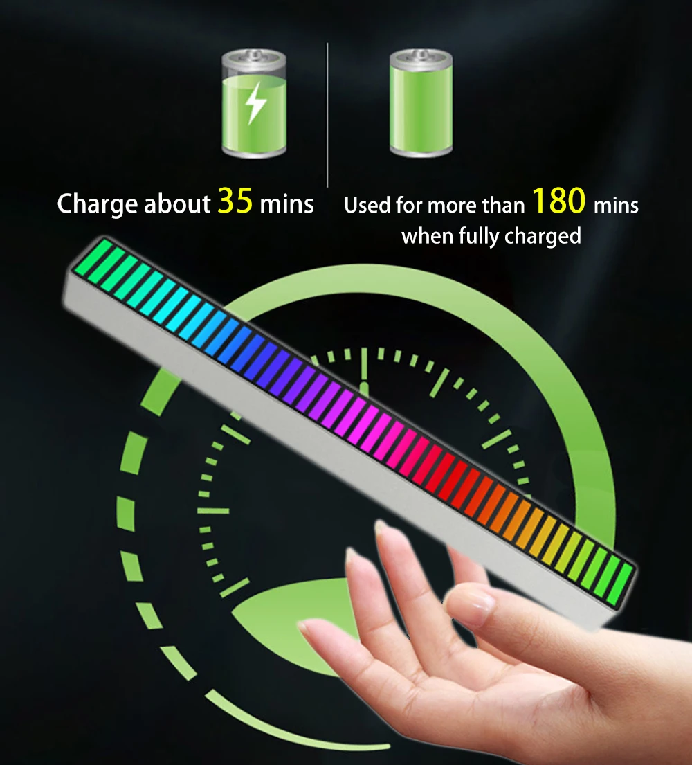 -Примечание:В посылка входит только один звук, активированный звукоснимателем. Пожалуйста, не подключайте к источнику питания более 5 В, чтобы не повредить материнскую плату, используйте оборудование питания, сертифицированное соответствующим ведомством. Не погружать в воду или использовать в условиях, когда влажность выше 90%. Материал: АБС + электронные компоненты Размер: 181*16*18,5 мм Особенности: Встроенный высокочувствительный микрофон (Голосовое управление) 32 красочные лампы бусины Не менее 8 режимов отображения 4 уровня яркости регулируется 5-уровневая регулировкой скорости 18 цветовых режимов регулируется Поставляется с AGC автоматическим контролем усиления Эксклюзивный интеллектуальный алгоритм деnoising, может использоваться в шумной среде Параметры продукта: Входное напряжение:> 5 в постоянного тока 1A Входной интерфейс: USB Частотная характеристика: 50-16 кГц Инструкции: Кнопка «режим/скорость»: короткое нажатие, чтобы включить режим «Белый»-выбор режима; Длительное нажатие, чтобы включить красный-Выберите 5 скоростей Цвет/яркий ключ: короткое нажатие, чтобы включить белый-Выберите цвет; Длинное нажатие, чтобы включить зеленый-Выберите 4 уровня яркости Нажмите две кнопки одновременно: Нажмите одновременно, чтобы включить синий-чтобы узнать спектр шума окружающей среды Нажмите и удерживайте цвет одновременно при включении питания: Введите режим настройки усиления Включение питания (только для модели аккумулятора): Нажмите кнопку цвета после выключения питания Выключение (только для модели батареи): Держите лицо вниз в течение 3 секунд Опционально Питание от USB (необходимо связать usb-кабель для использования) Перезаряжаемый (встроенный аккумулятор 300 мАч) Упаковочный лист Светильник-1 шт. 1 кабель для передачи данных 1 основание 1 х Двусторонняя лента 1 х Руководство