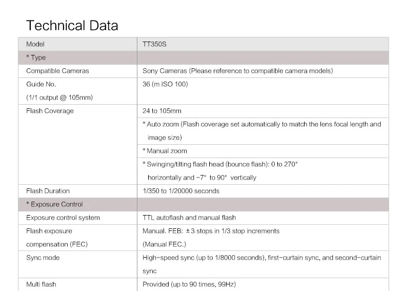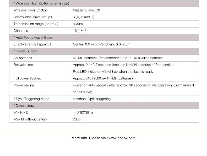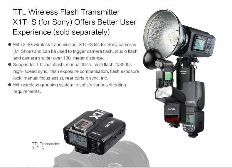 Особенности:Два стиля передачи, чтобы предложить креативный светильникОптическая передача с равномерным освещением и стабильным выходом2,4G Беспроводная передача с функциями «Все в одном» и 100 метров дальнейшей передачи.Полный TTL функцииПоддерживает HSS (макс. 1/8000s), ТЭК, передние и задние высокая скорость синхронизации, вспышка, ручная вспышкаTTL беспроводной триггер вспышки X1T-S предлагает лучший пользовательский опыт (продается отдельно)С беспроводной передачей 2,4G X1T-S (для Sony) может использоваться для запуска вспышки камеры, студийной вспышки и затвора камеры на расстоянии более 100 метров.Поддержка TTL autoflash, Высокоскоростная синхронизация 1/8000, компенсация экспозиции вспышки, блокировка вспышки, моделирование вспышки и т. д.С беспроводной системой группирования (макс. 5 групп и 32 канала) для удовлетворения различных требований к съемке.Большая ЖК-панель обеспечивает удобную работу.Удобная ЖК-панель с точечной матрицейС ЖК-панелью с точечной матрицей для обеспечения четкого и легкого использования.Используйте 4 функциональные кнопки для изменения различных настроек в зависимости от различных ситуаций.Выберите циферблат, чтобы выбрать количество настроек.Выдерживает перегрев и полезные функцииGN60 (m ISO 100, @ 105 мм), 22 шага выходной мощности (1/1-1/128)Прибл. 0,1-2,2 s время рециркуляции, 210 вспышек полной мощности (с использованием 2500 мА Ni-MH батарей)Поддержка режимов TTL / M /S1/ S2, автоматическое/Ручное Масштабирование 24-105 м.С настройками пользовательских функций C.Fn.Спецификация:Модель: TT350SСовместимая камера s: Sony беззеркальная цифровая камераРуководство № (1/1 выход @ 105 мм): 36(m ISO 100)Система контроля экспозиции: TTL автовспышка и ручная вспышкаКомпенсация экспозиции вспышки (FEC): Руководство FEB. : ± 3 остановки с шагом 1/3 остановки (ручной FEC.)Режим синхронизации: Высокоскоростная синхронизация (до 1/8000 секунд), синхронизация с занавес и синхронизация с занавесМульти Вспышка: предоставляется (до 90 раз, 99 Гц)Функция беспроводной вспышки: Master, slave, offУправляемые Подчиненные группы: 3(A,B и C)Диапазон передачи (прибл.): ≤ 100 мКаналы: 16(1 ~ 16)Эффективный диапазон (прибл.): центр: 0,6 ~ 4 м/Окружность: 0,6 ~ 2,5 мБатарейки AA: никель-металлогидридные аккумуляторы (рекомендуется) или 2 щелочные батареи LR6Время рециркуляции: Approx.0.1 ~ 2,2 секунды (eneloop ni-mh аккумуляторы Panasonic). Красный светодиодный индикатор будет светильник, когда вспышка будет готова.Вспышки полной мощности: Approx.210 (аккумуляторы ni-mh 2500mA)Энергосбережение: Автоматическое выключение После прибл. 60 секунд работы без холостого хода.(60 минут при установке в качестве подчиненного)* Режим синхронизации: горячий башмак, оптический запускШ * В * Д: 140*62*38 ммВес без аккумулятора: 200 гПередатчик Godox XPro-S:Характеристики:Модель: Xpro-SСовместимые камеры: Совместимые камеры Sony серии камер (TTL autoflash) Поддержка камер с разъемом для синхронизации ПК ..Источник питания: 2 * батарейки типа ААTTL автовспышка: ДаРучная Вспышка: ДаСтробоскопическая вспышка: ДаВысокоскоростная синхронизация: ДаСекундная синхронизация: ДаКомпенсация экспозиции вспышки: Да. ± 3 остановки с шагом 1/3 остановкиБлокировка вспышки: ДаПомощь в фокусировке: ДаМоделирующая лампа: Управляйте модельной лампой с помощью триггера вспышкиПчеловод: Управляйте пчеловодом с помощью триггера вспышкиБеспроводной окружающая Обстановка: ресивер конец может управлять камерой с