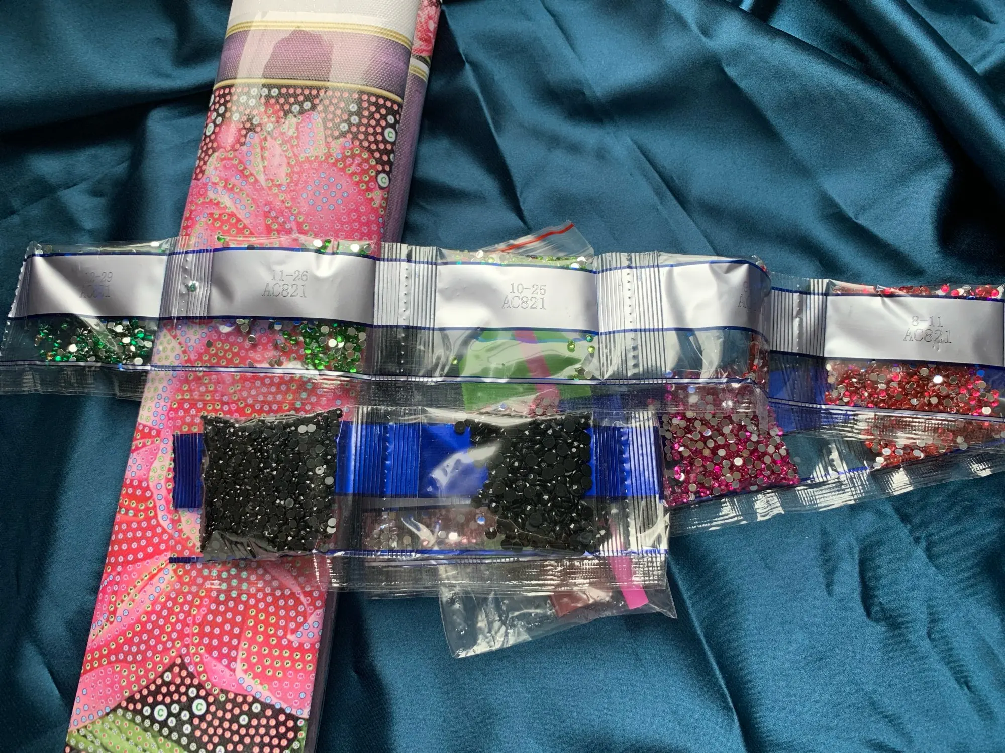 -В комплект входит:-ткань, напечатанная с таблицей дизайна-красочные бриллианты-точечная ручка-лоток для сверления, воск