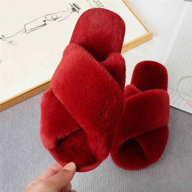 Модные женские тапочки из искусственного меха, теплые пушистые домашние тапочки, удобные женские домашние тапочки с перекрестными шлепанцами, женские шлепанцы на плоской подошве