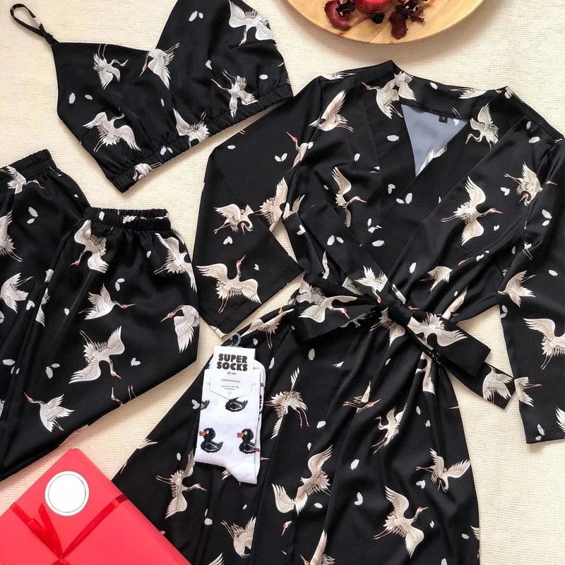 Комплект пижамный женский атласный, модный халатик с принтом авокадо, пикантный пеньюар, шелковое кимоно, халат для невесты, одежда для сна