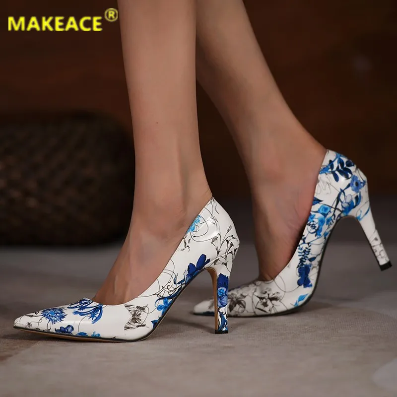 Женские туфли на высоком каблуке 9 см, с цветочным принтом