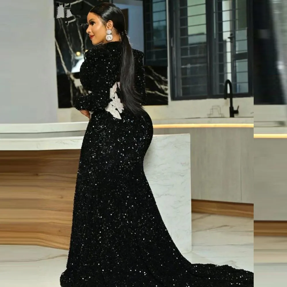 Черные блестящие искусственные вечерние платья с вышивкой бисером аппликации V-образным вырезом с длинным рукавом Aso Ebi платье для выпускного вечера со шлейфом