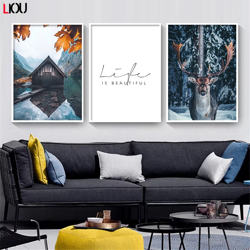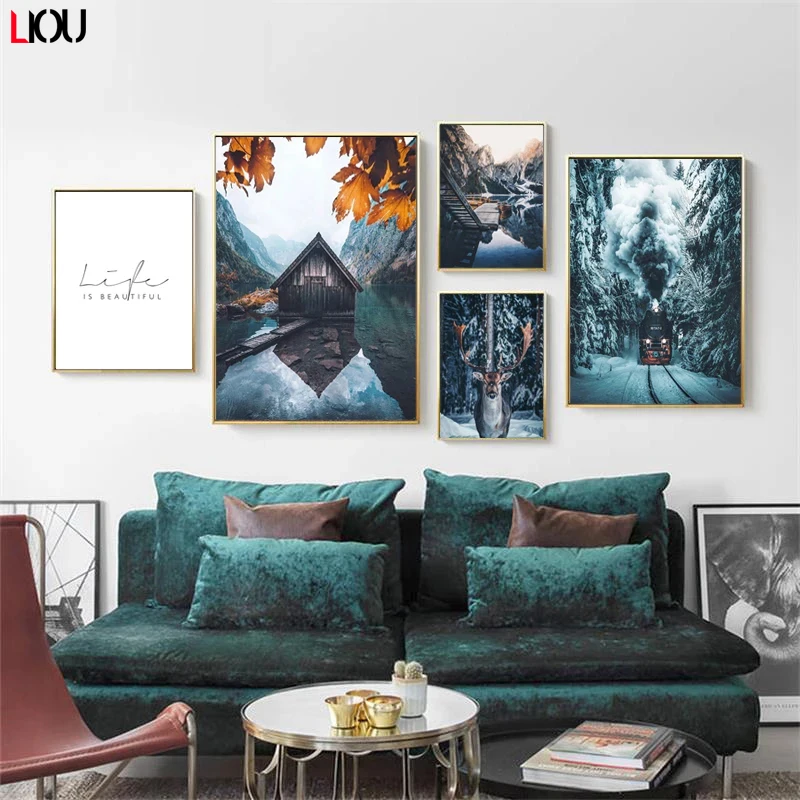 Водопад горное озеро, скандинавский, скандинавский, постеры, природный пейзаж, настенная живопись, холст для украшения спальни