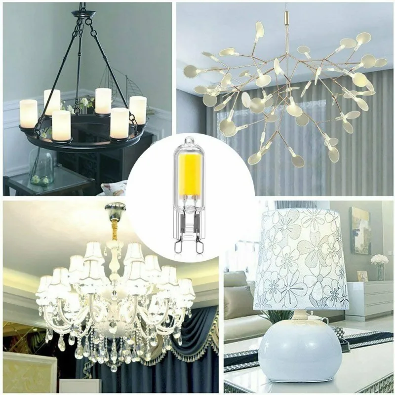 Feature:Not flash, super brightReplace the halogen lampHigh-power chip, high luminous fluxSpecification:Bulb Base: G9/G4Material: GlassLight Source: COBLight Color: White/Warm WhiteVoltage: AC220VPower:7W 9W 12W 15WLumen: 200LM/300LM/400LMLuminosity: 360°