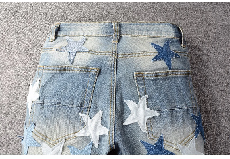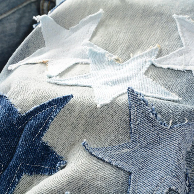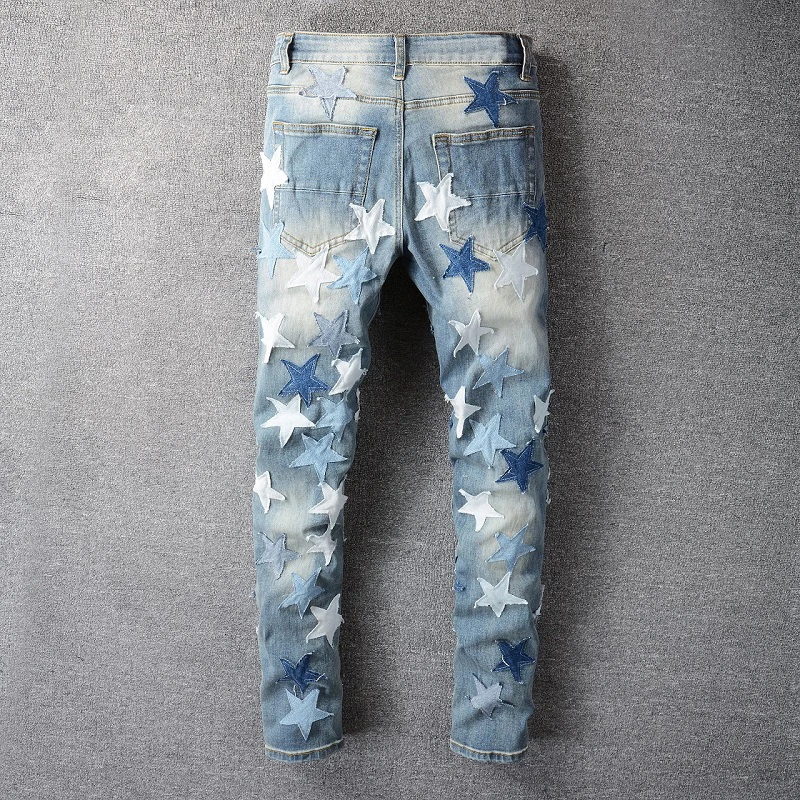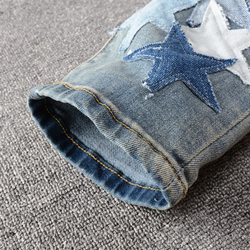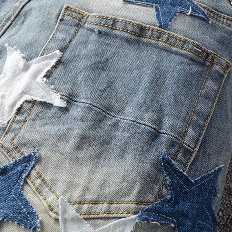 Мужские рваные джинсы с нашивками в виде звезд; Уличная одежда; Лоскутные рваные брюки с потертостями; Обтягивающие Стрейчевые брюки