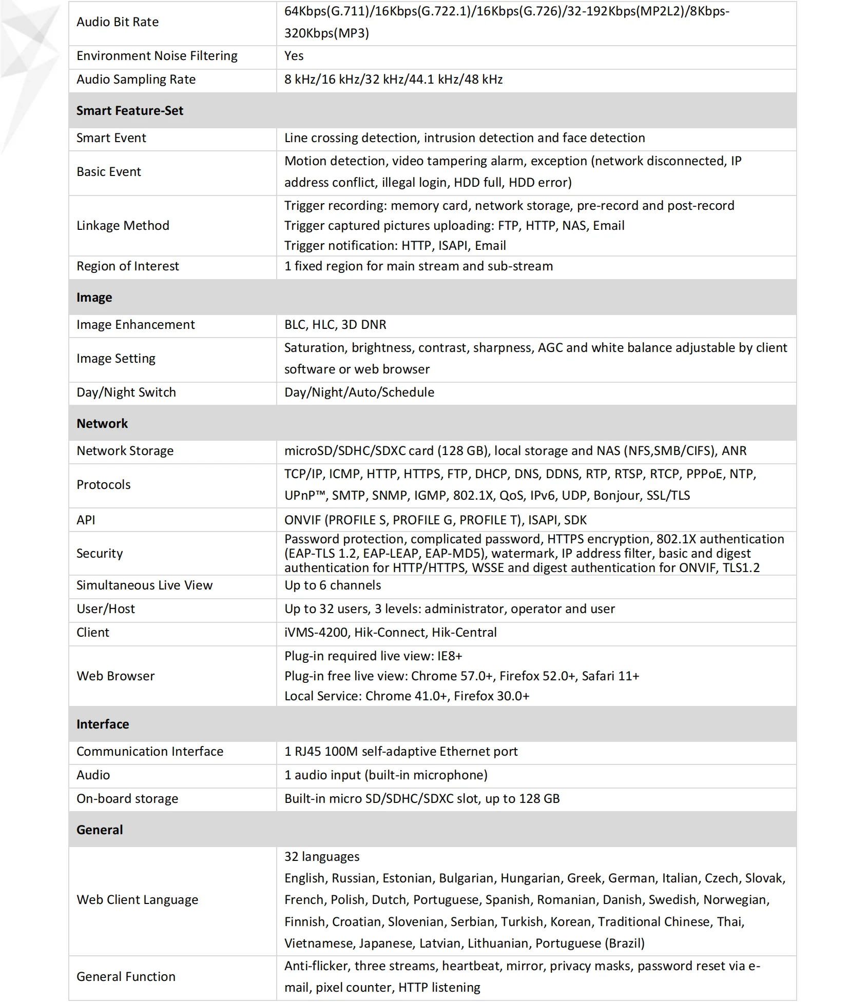 System CompatibilityONVIF, PSIA, CGI, ISAP