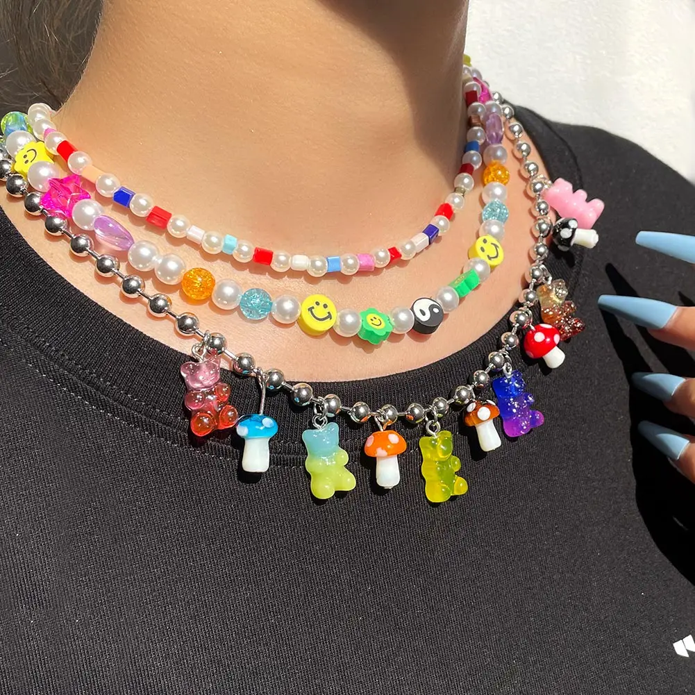 Ожерелье с шариками из нержавеющей стали, серебристого цвета, милый мармеладный медведь, гриб, чокер из бисера, ожерелья для женщин, ювелирные изделия Y2K, новинка