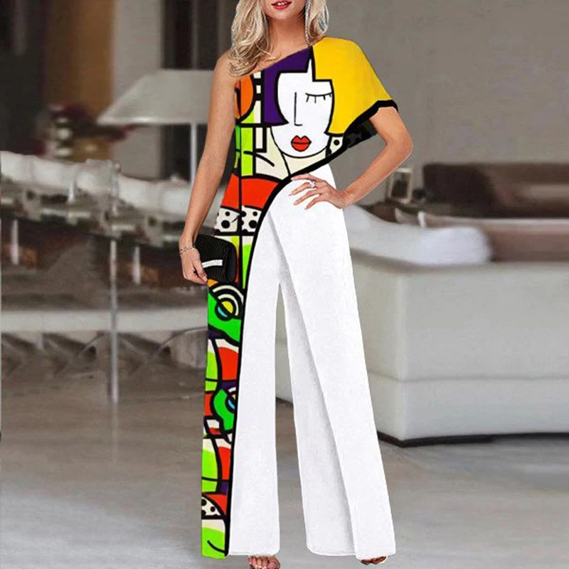 Женский комбинезон на одно плечо, с принтом и широкими штанинами